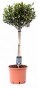 Olive tree on stem with bottle of olive oil in a white ceramic pot (total height 45 cm)